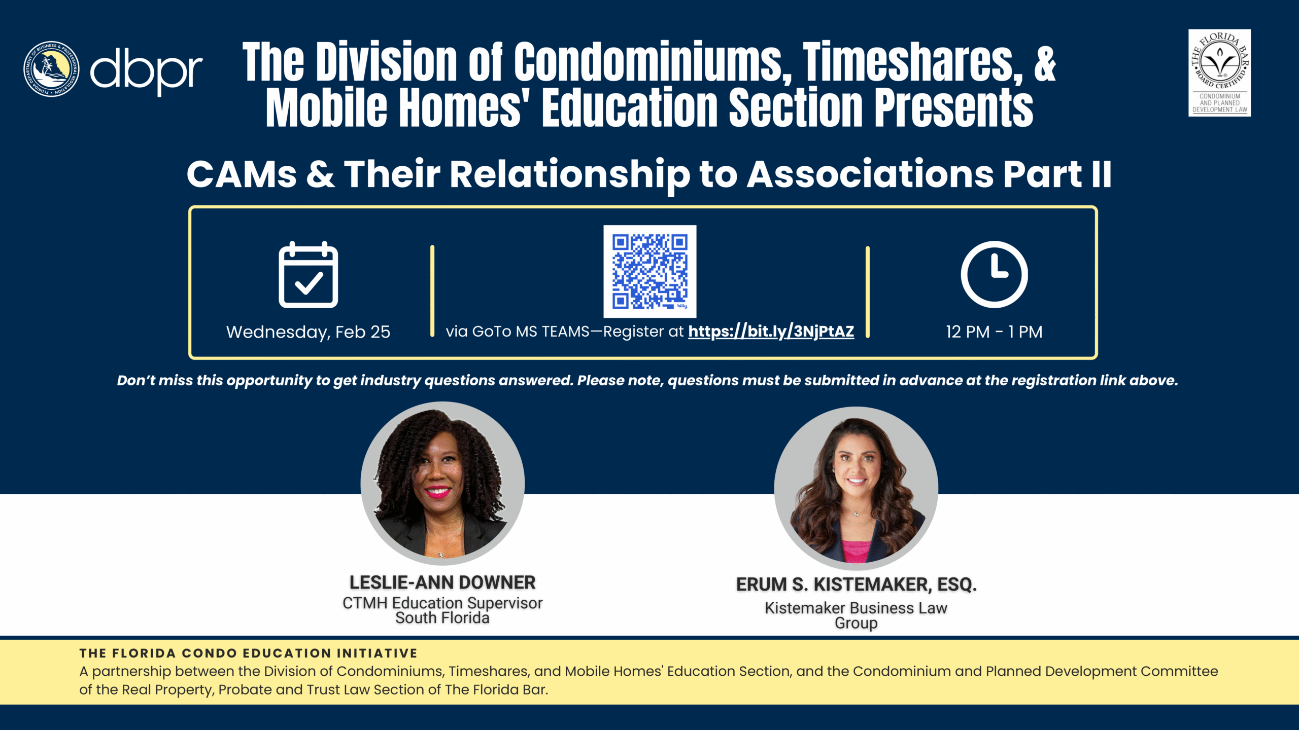 Don’t miss Part II of the Florida Condo Education Initiative session: CAMs & Their Relationship to Associations, happening Wednesday, February 25 from 12–1 PM via MS Teams.